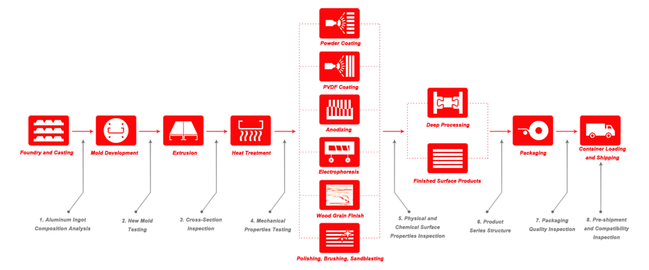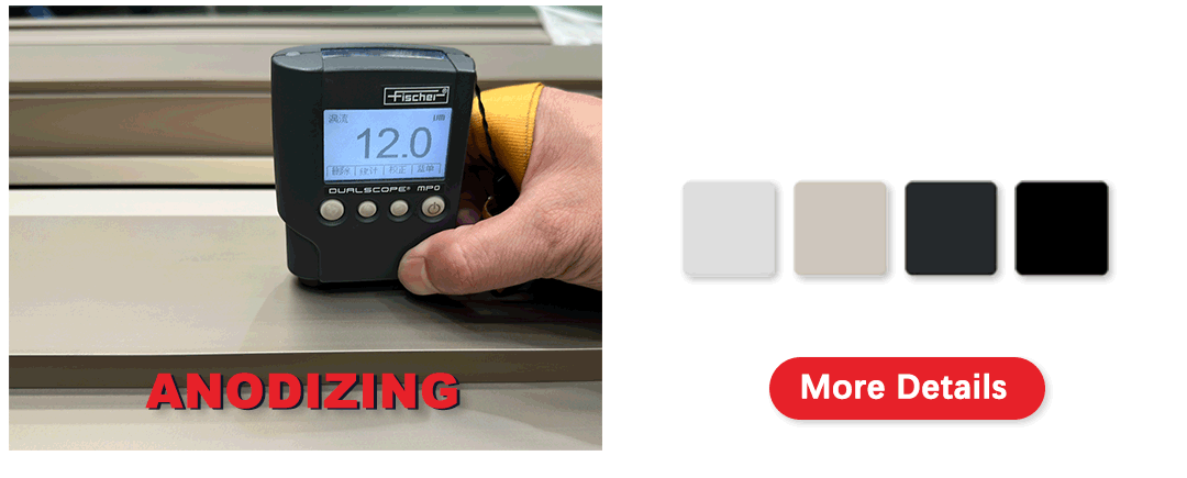 Surface Finishes: Mill finish, anodizing, powder coating, electrophoresis, wood grain transfer, fluorocarbon coating, sandblasting, brushing, polishing